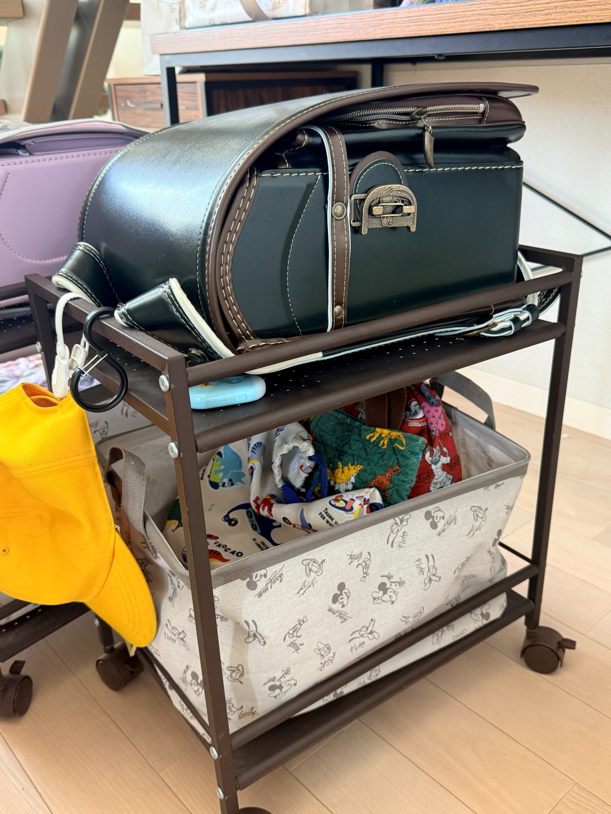 これが地味にすごく便利。机の下にすっぽり入れておいて、帰ってきたら引き出すだけ。邪魔にならないし、出し入れも子どもが自分でできます。